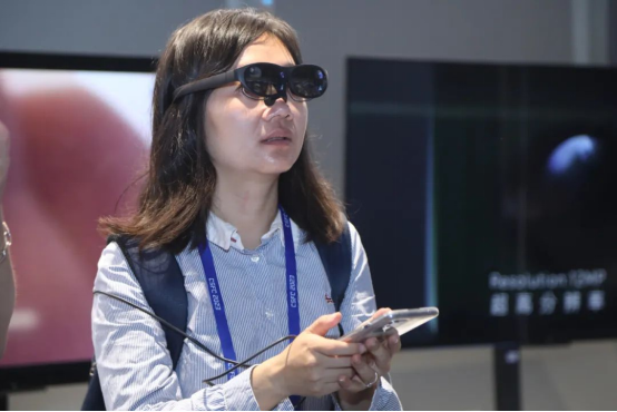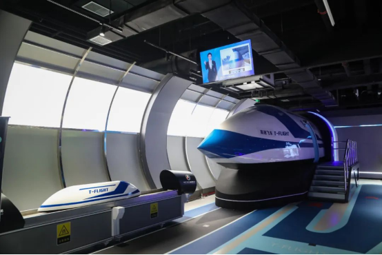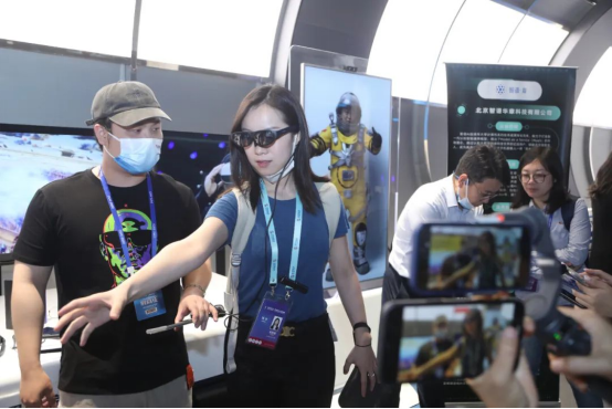 “交感穿梭”展区展现未来车站的场景,巨大的磁悬浮列车头停靠在车站内,集中展示了包括超导磁悬浮、增强现实、虚拟现实、空间音频、数字人等技术在内的前沿技术。在这座未来车站中,“旅客们”可以通过优奈柯恩等企业的VR/AR终端显示,感受交互体验,在虚实相生的世界里获取信息。显示设备通过空间计算技术,基于即时定位与地图构建的智能算法,基于摄像头、通过AI深度学习技术,实现对人手的高精度、低延迟识别和追踪,可以精准追踪使用者运动轨迹,并结合自主研发23点自然手势交互,观众可以在这里体验弹奏虚拟钢琴。同时,这里还展陈了蚁视科技的85度超大视场角AR/VR两用智能眼镜,由北京智谱华章和凌云光共同开发的手语数字人将为听觉障碍的旅人带来指引。