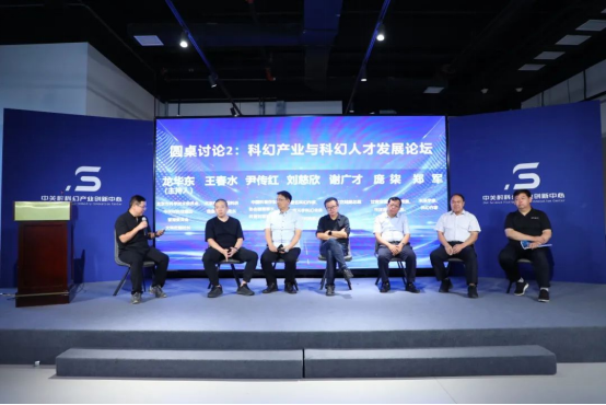 其后,刘慈欣、庞柒、谢广才、严蓬、王春水、郑军六位嘉宾以“科幻产业与科幻人才发展论坛”为主题展开了圆桌讨论,论坛由龙华东主持。