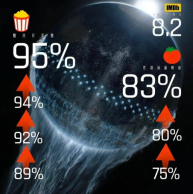 在海外最大的电影评分网站IMDB上,一个是专业人影评,一个是观众打分。至截稿,《流浪地球2》得到的分数,分别是83%和95%。在国内最受欢迎的科幻片《星际穿越》,此处得分分别为72%和86%。