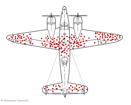 盟军曾研究库中机身弹孔的位置,依此加固机甲,降低飞机坠毁率。所以迫切需要加固的,是翅膀和尾翼吗?——事实恰恰相反。数学家Abraham Wald及哥伦比亚大学统计研究组认为:要给完全没有弹孔的部位更多防御——因为那些飞机只在此中了一发子弹,就没能返航。