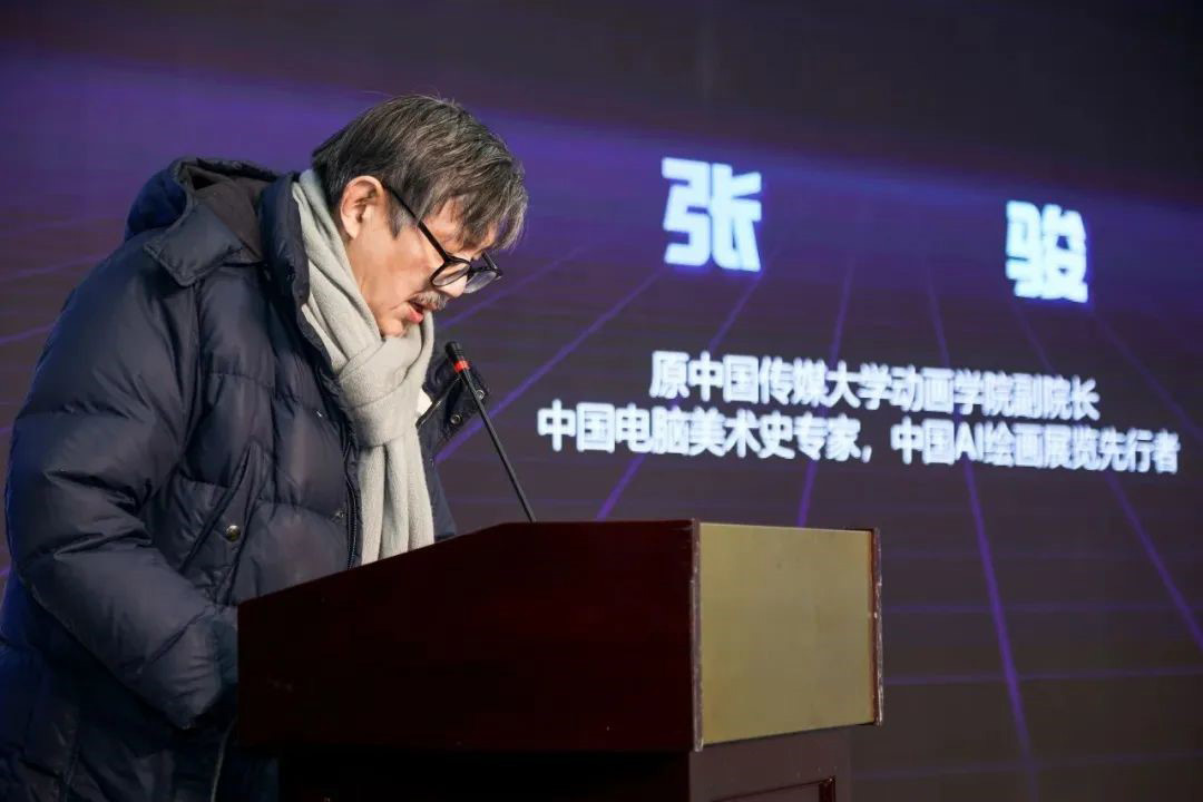 (原中国传媒大学动画学院副院长、中国电脑美术史专家、中国AI绘画展览先行者张骏发表主题报告)