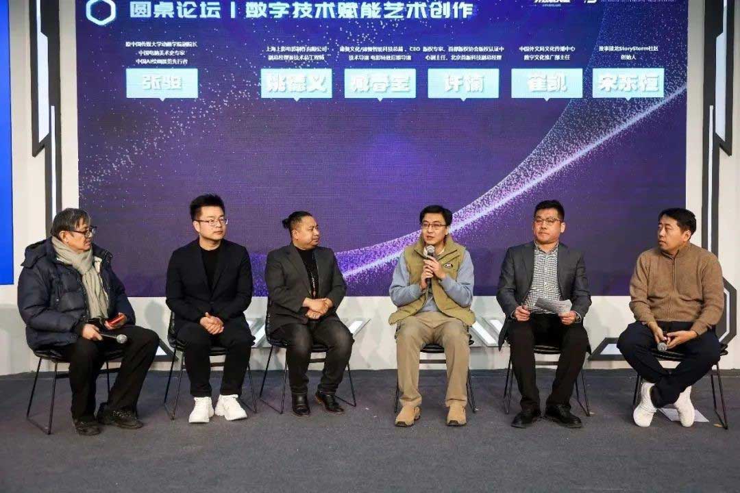 论坛最后一个环节是圆桌讨论。在张骏老师的主持下,中国外文局文化传播中心数字文化推广部主任崔凯,首版科技副总经理,首都版权协会版权认证中心副主任许楠,故事接龙StoryStorm社区创始人宋东桓与姚德义、臧春宝两名艺术家,围绕AIGC创作的艺术价值及判断标准、AI绘画等作品的版权归属和对技术赋能艺术的未来展望等话题展开讨论。嘉宾们从实际出发,列举了在实践过程中遇到的问题和困境,展开详细的讨论。