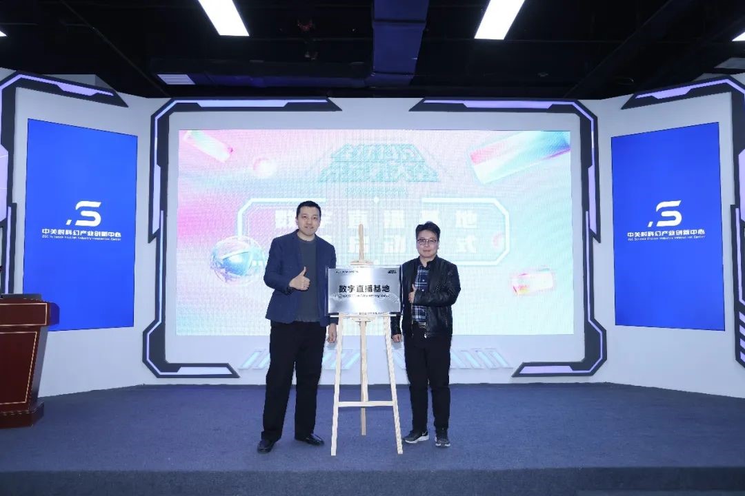 在数字直播基地启动仪式上,中关村科幻产业创新中心总经理孙世诚、北京聚力维度科技有限公司 CEO赵天奇共同上台,为中关村科幻产业创新中心直播基地揭牌。