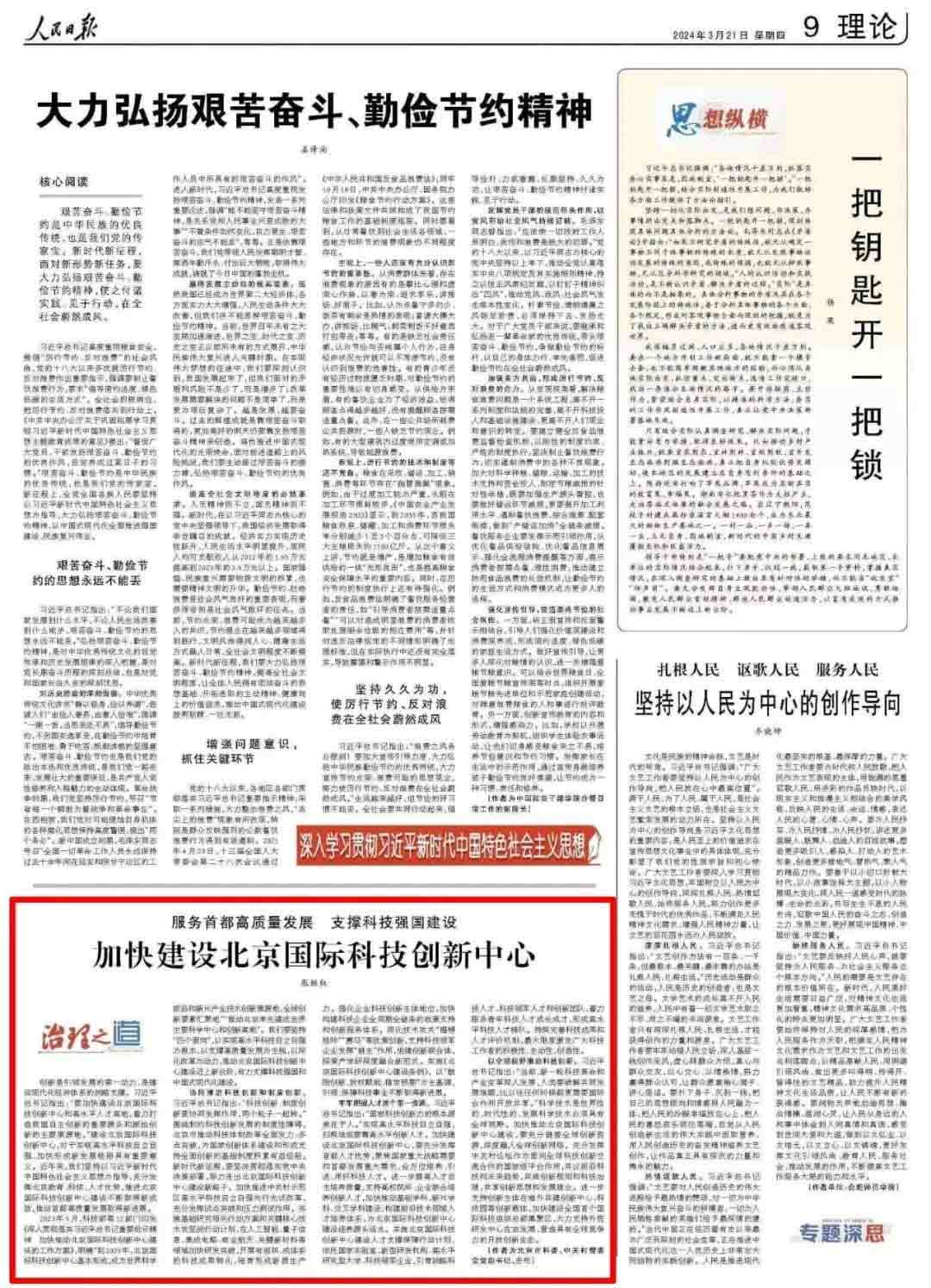 3月21日,北京市科学技术委员会、中关村科技园区管理委员会党组书记、主任张继红在《人民日报》2024年3月21日第9版发表署名文章《服务首都高质量发展 支撑科技强国建设 加快建设北京国际科技创新中心》,全文如下: