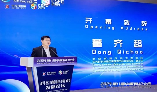 市科委、中关村管委会副主任董齐超开场致辞。他在致辞中提出,近年来,在市委市政府的大力支持下,北京市科幻产业坚持探索科技文化融合发展的新赛道,实施科技创新、跨界融合战略,科幻前沿技术实现快速发展,在人工智能、光学与视觉技术、数字创作等多个科幻技术应用领域取得了长足的进步,成为了推动科技创新和文化创意领域发展的重要力量。展望未来,市科委、中关村管委会将持续加强对科幻前沿技术创新的支持和引导,着力补短板、强弱项、优服务,促进科幻前沿技术领域更具战略性、引领性的创新突破。