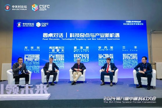 在北京市科学技术委员会、中关村科技园区管理委员会文化科技处(科普处)副处长龙华东的主持下,弗拉基米尔·诺罗夫,三丰与西班牙著名汉学家、翻译家、西班牙语《三体》译者夏海明和Soft AI创始人兼代表理事,韩国科学技术院(KAIST)教授李丙旭一起探讨未来产业的新机遇。围绕科幻对科技的影响,四位嘉宾与主持人畅所欲言,并对未来如何加强科幻前沿技术的国际合作提出自己的想法。