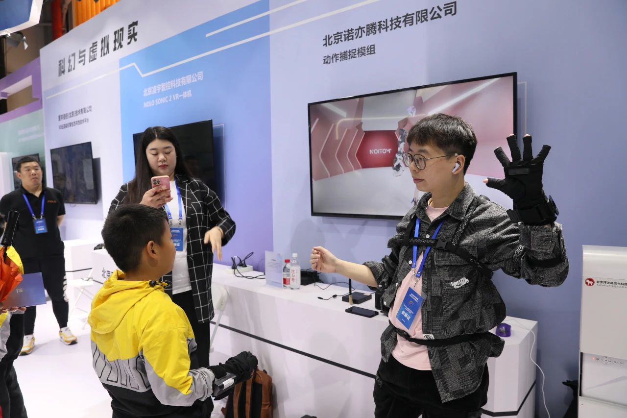 展示以中关村科幻产业创新中心为主的科幻产业集聚区和虚拟现实产业园建设成果,如元客视界重光照4D动态光场重建系统、渲光科技3D渲染引擎、环宇蓝博微距背投智画互动空间、易智时代VR航空航天学习机、拜波赫激光投影移动式互动一体机、诺亦腾动作捕捉技术单元、NOLO SONIC 2 VR一体机、寰宇信任3D云渲染引擎生态共性技术平台等。