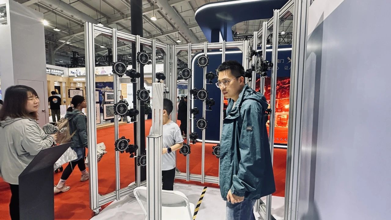 元客视界是国内领先的数字内容制作解决方案与服务供应商。该展项是目前行业最领先的重光照4D动态光场重建系统,可以一次性获取动态的人物模型数据,同时采集不同状态的贴图材质信息,高品质重现不同视角下观看人体的光影效果,输出4D高精度几何模型和8K贴图,扫描精度可达皮肤毛孔级别,具有高视觉保真度。它增加数字人表情的精度和细节,同时也极大缩短了制作周期,从以前数月提升至几天甚至几个小时。像数字人子剑、米卢、徐梦桃等都是由这台装备扫描制作。